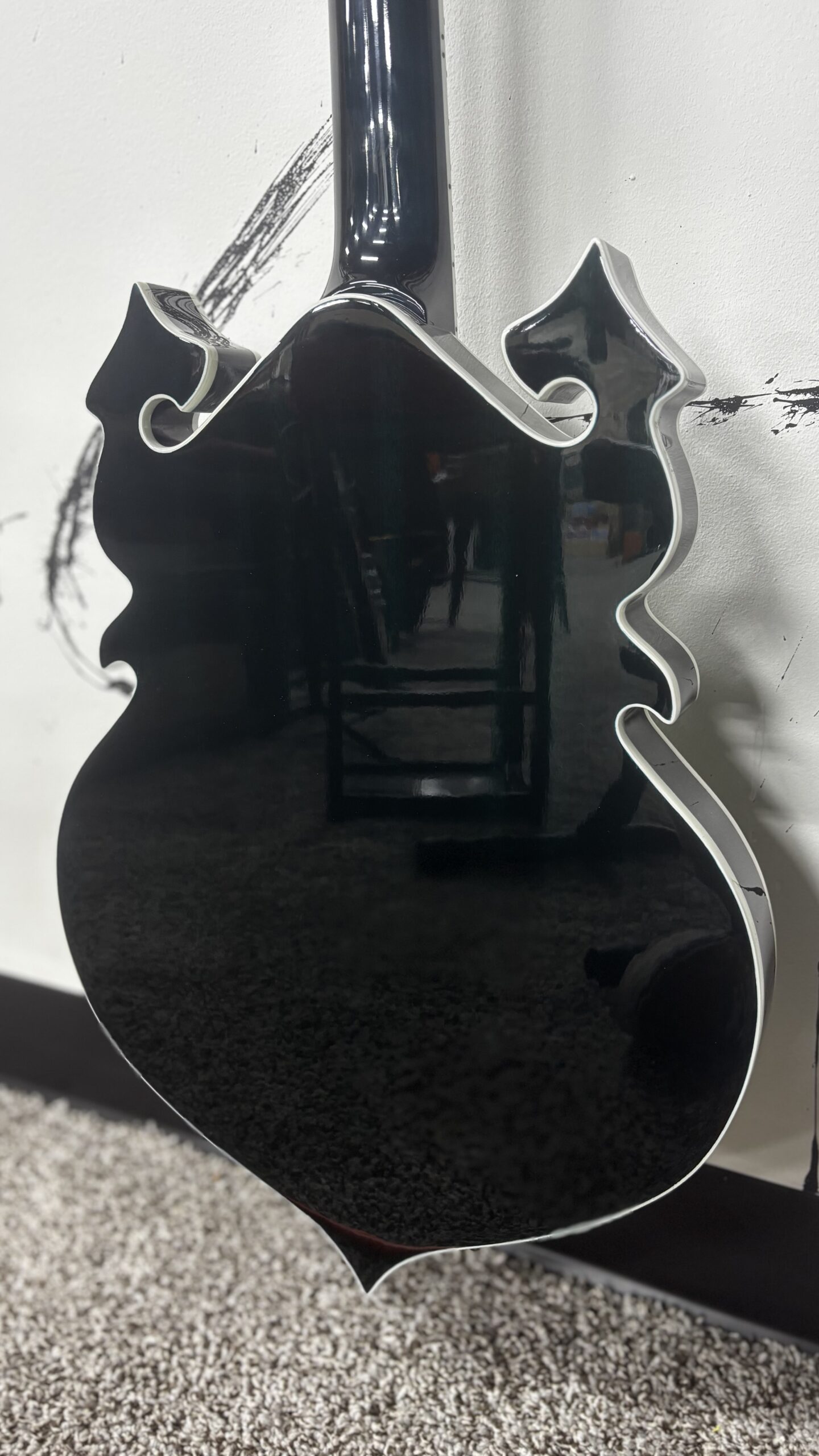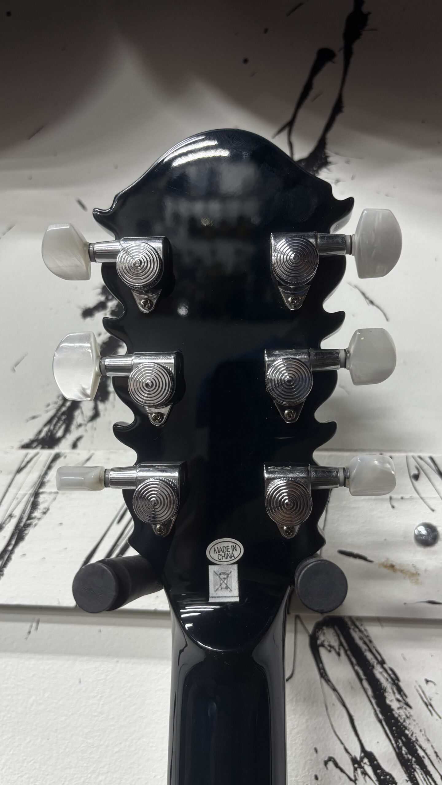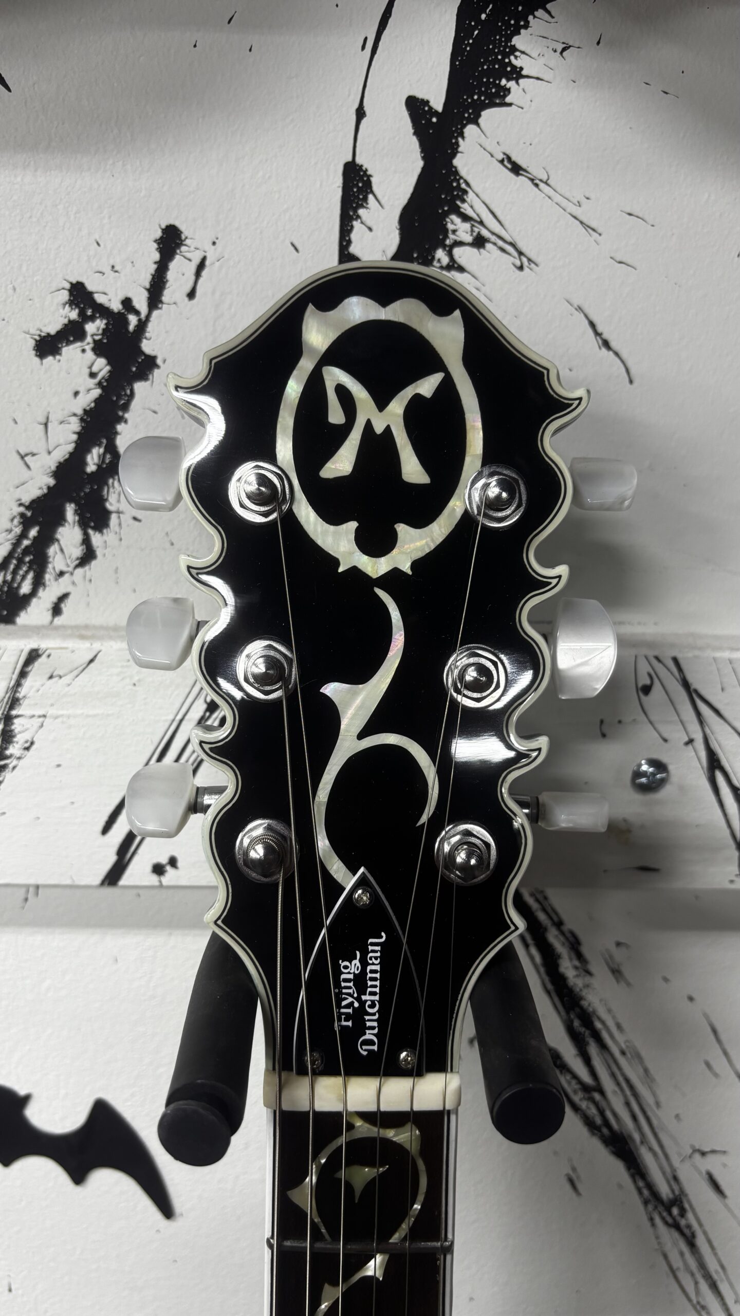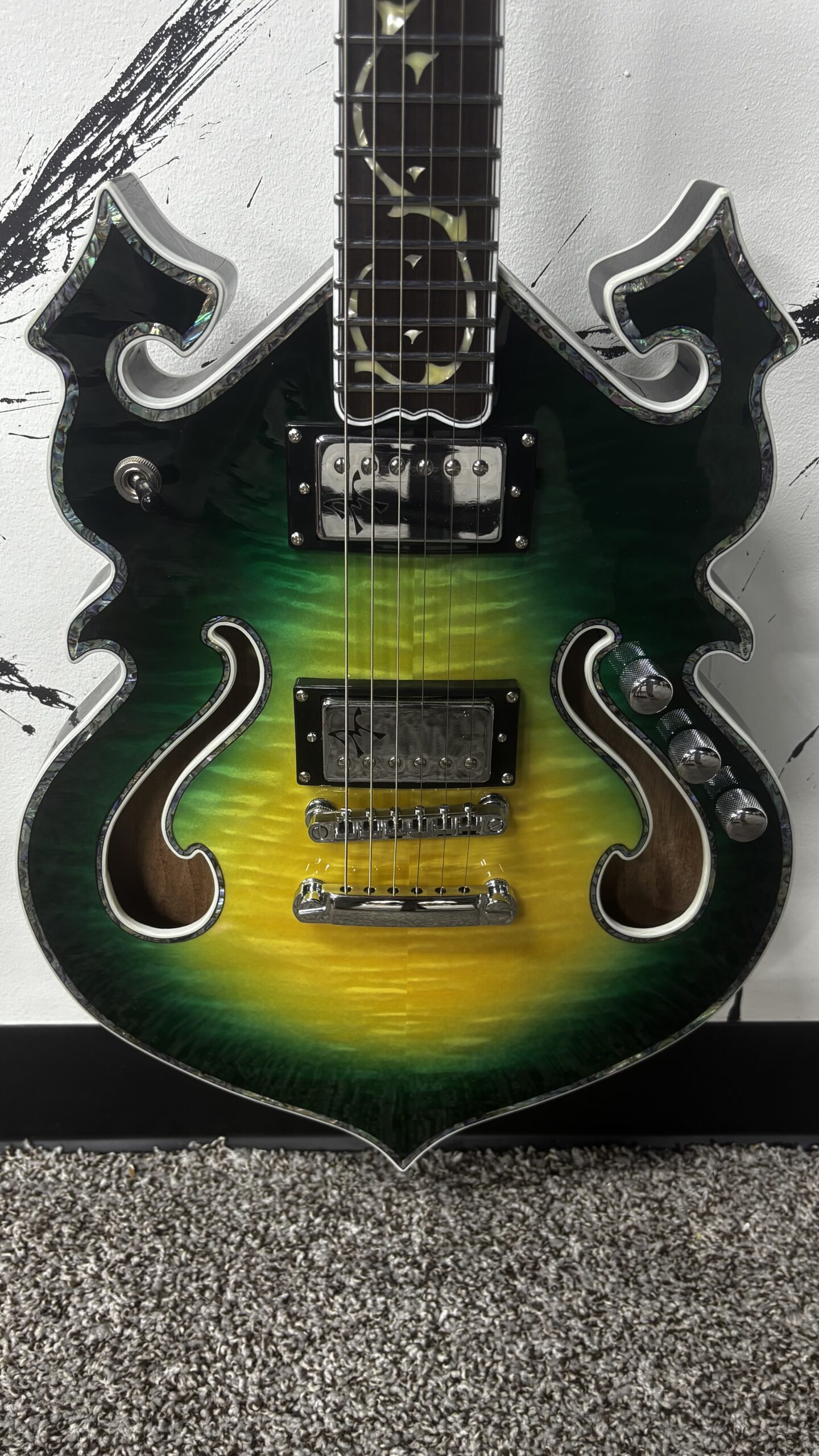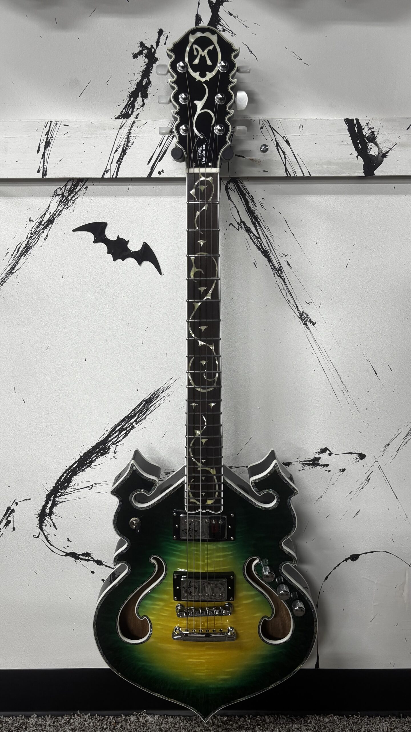 Minarik Flying Dutchman in stunning Calypso Green flame burst. This eye-catching semi-hollow features ornate nautical inlays, abalone binding, carved body contours, and dual humbuckers for rich tone and strong sustain. A true boutique statement piece that blends art and performance—equally at home on stage or in a collection. Professionally cleaned and set up, ready to play.